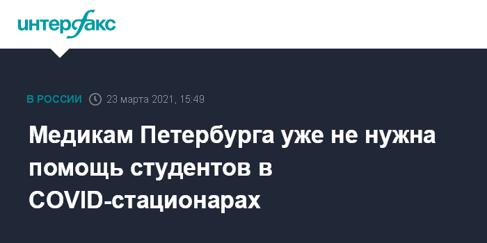 Как сообщила пресс-служба администрации, губернатор отметил, что в связи со снижением заболеваемости и общего количества активно больных дефицита основного медицинского персонала на данный момент в Петербурге нет: студенты и преподаватели медицинских вузов, привлекавшиеся к лечению COVID-больных, вернулись к очному обучению.