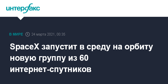 Москва. 24 марта. INTERFAX.RU - Американская компания SpaceX планирует в среду вывести на орбиту очередную партию из 60 интернет-спутников Starlink, сообщил специализированный сайт Spaceflight Now.