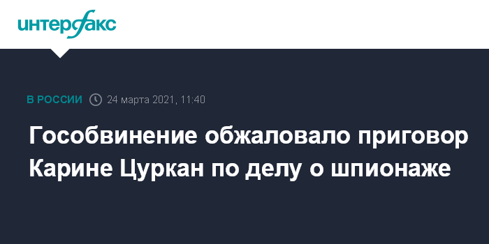 Москва. 24 марта. INTERFAX.RU - Государственное обвинение обжаловало приговор бывшему топ-менеджеру "Интер РАО" Карине Цуркан, осужденной за шпионаж, сообщили "Интерфаксу" в правозащитном объединении "Команда 29", адвокаты которой защищают Цуркан.