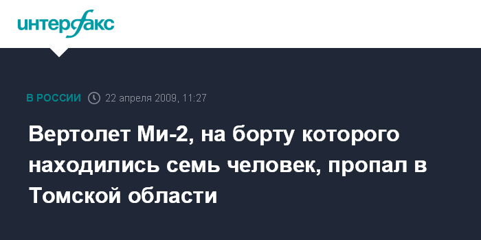 Москва. 22 апреля. INTERFAX.RU - Вертолет Ми-2, принадлежащий компании "Сибавиатрейд" (Красноярск), пропал в Томской области, на его борту находятся семь человек - два члена экипажа и пять пассажиров, сообщил Сибирский региональный центр МЧС.