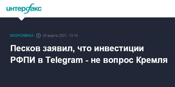 Москва. 24 марта. INTERFAX.RU - Приобретение Российским фондом прямых инвестиций (РФПИ) облигаций Telegram Group Inc не является вопросом Кремля, однако любые успешные инвестиции можно приветствовать, сказал журналистам пресс-секретарь президента РФ Дмитрий Песков.