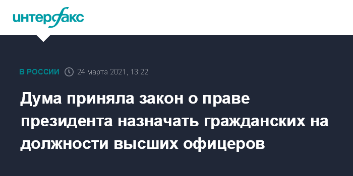 Москва. 24 марта. INTERFAX.RU - Государственная Дума приняла в третьем, окончательном чтении закон, который вводит единый порядок назначения президентом России граждан, не являющихся военнослужащими, на должности высших офицеров в силовых ведомствах.