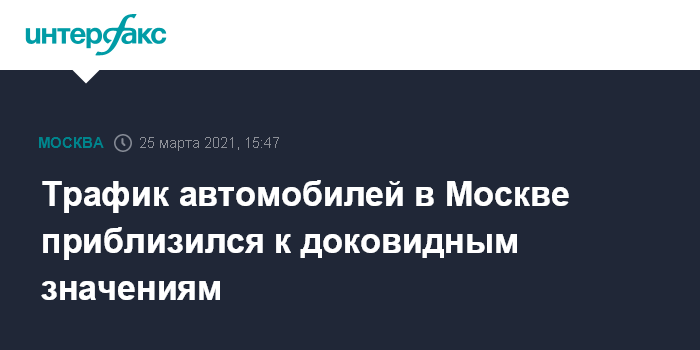 Москва. 25 марта. INTERFAX.RU - В Москве сейчас по дорогам ездит в среднем около 2,8 млн автомобилей, это число близко к "доковидному" значению, сообщил замруководителя Центра организации дорожного движения (ЦОДД) Дмитрий Горшков. По его словам, трафик постепенно увеличивается после снятия карантинных ограничений.