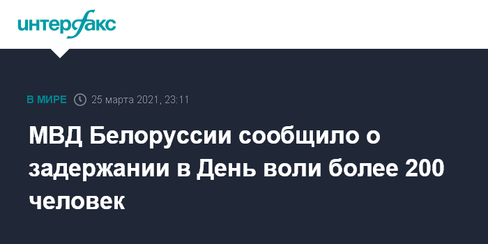 Москва. 25 марта. INTERFAX.RU - В Белоруссии за нарушение законодательства о массовых мероприятиях задержаны более 200 человек, говорится в сообщении в телеграм-канале пресс-секретаря МВД Ольги Чемодановой в четверг.