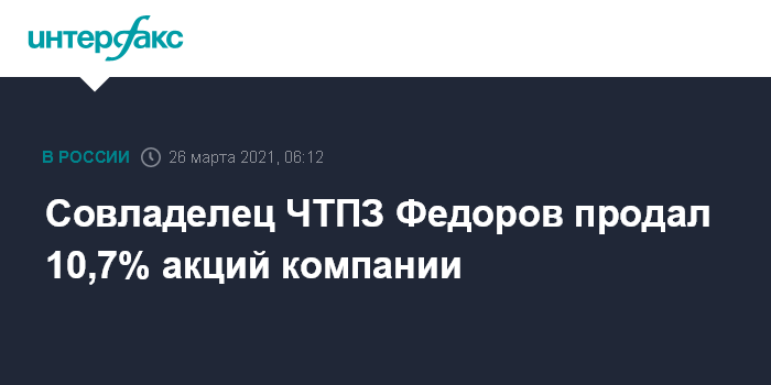 Москва. 26 марта. INTERFAX.RU - Павел Федоров продал принадлежавшие ему 10,67% акций ПАО "Челябинский трубопрокатный завод" (ЧТПЗ), следует из сообщения компании.