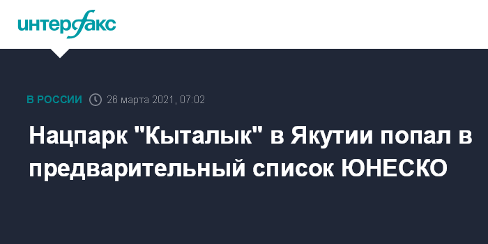 Москва. 26 марта. INTERFAX.RU - Национальный парк "Кыталык" в Аллаиховском районе попал в предварительный список всемирного наследия ЮНЕСКО, сообщает в пятницу пресс-служба Минэкологии Якутии.