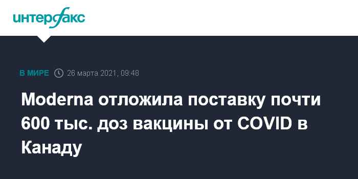 Москва. 26 марта. INTERFAX.RU - Американская компания Moderna отложила поставку 590,4 тыс. доз вакцины от коронавируса в Канаду из-за задержки при контроле качества, сообщила канадский министр по делам государственной службы и закупок Анита Ананд.