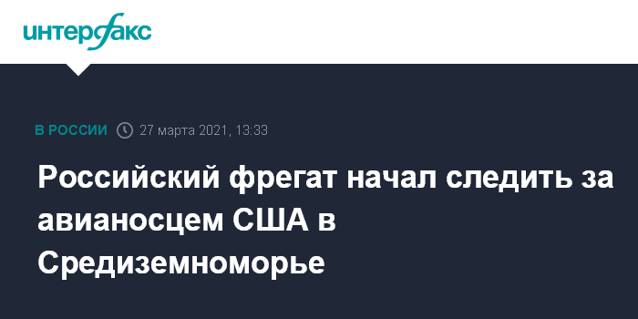 Москва. 27 марта. INTERFAX.RU - Ракетный фрегат Черноморского флота РФ "Адмирал Григорович" следит за действиями авианосной ударной группы ВМС США, возглавляемой атомным авианосцем "Дуайт Эйзенхауэр", которая находится в Восточном Средиземноморье.