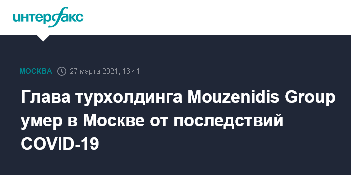 Москва. 27 марта. INTERFAX.RU - Основатель и президент греческого туристического холдинга Mouzenidis Group Борис Музенидис умер в Москве в возрасте 60 лет от остановки сердца, которая стала осложнением коронавируса, сообщают в субботу СМИ Греции.