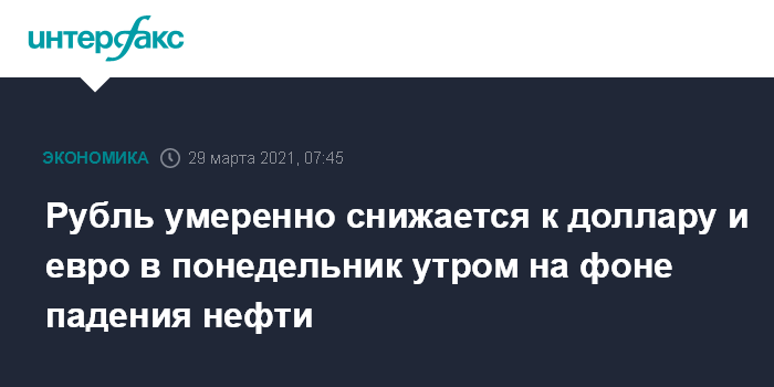 По мнению экспертов "Интерфакс-ЦЭА", снижение валютного курса рубля к доллару и евро на старте торгов 29 марта связано с падением цен на нефть, демонстрировавших стремительный рост на торгах в пятницу. В понедельник утром СМИ сообщили о снятии с мели контейнеровоза Ever Given, перекрывшего Суэцкий канал 23 марта. По данным Минэнерго США, через Суэцкий канал проходит примерно 9% мировых морских поставок нефти.