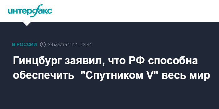 Москва. 29 марта. INTERFAX.RU - Российские ученые способны масштабировать производство вакцины "Спутник V" для того, чтобы обеспечить ею весь мир, качество и безопасность препарата не вызывают сомнений, сообщил директор Национального исследовательского центра эпидемиологии и микробиологии имени Гамалеи академик РАН Александр Гинцбург.
