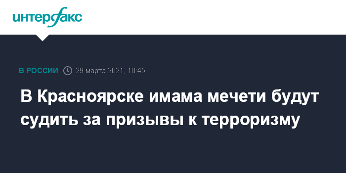 Москва. 29 марта. INTERFAX.RU - В Красноярске суд рассмотрит дело имама мечети, которого обвиняют в публичном оправдании терроризма и призывах заниматься терроризмом, сообщили в СК.