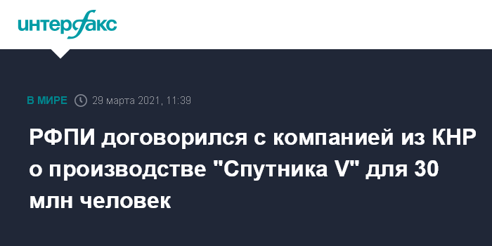 Москва. 29 марта. INTERFAX.RU - Российский фонд прямых инвестиций (РФПИ) договорился с китайской компанией о производстве вакцины "Спутник V" для 30 млн человек с мая, сообщает пресс-служба фонда.