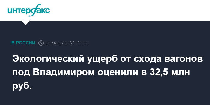 Москва. 29 марта. INTERFAX.RU - Росприроднадзор рассчитал вред, причиненный почве при сходе с рельсов железнодорожного состава с мазутом на станции Новки Камешковского района Владимирской области. Об этом сообщает межрегиональное управление Росприроднадзора по Ивановской и Владимирской областям.