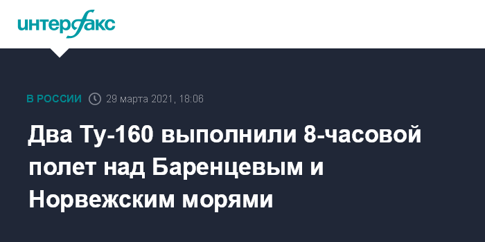 Москва. 29 марта. INTERFAX.RU - Два российских "стратега" Ту-160 "Белый лебедь" выполнили полет над Баренцевым и Норвежским морями, сообщили в Минобороны РФ.