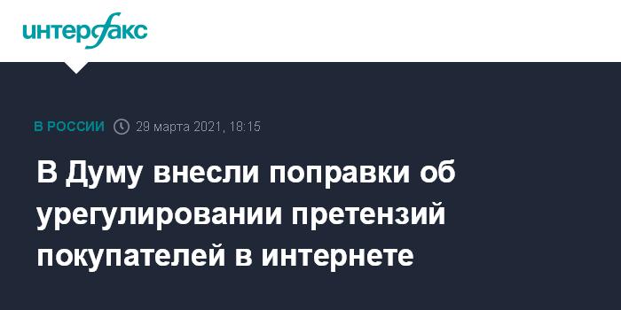 Москва. 29 марта. INTERFAX.RU - Правительство внесло в Госдуму поправки к закону о защите прав потребителей, которые позволят покупателям и интернет-продавцам предъявлять претензии и урегулировать споры по ним в досудебном порядке через специальный онлайн-сервис.