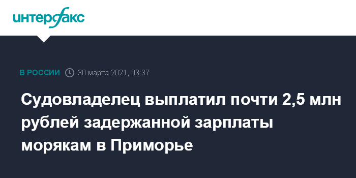 Москва. 30 марта. INTERFAX.RU - Приморские моряки, работавшие на судах иностранной компании "Нортвест Шип Мэнэджмент ЛТД", получили около 2,5 млн рублей задержанной зарплаты, сообщила во вторник пресс-служба Дальневосточной транспортной прокуратуры.