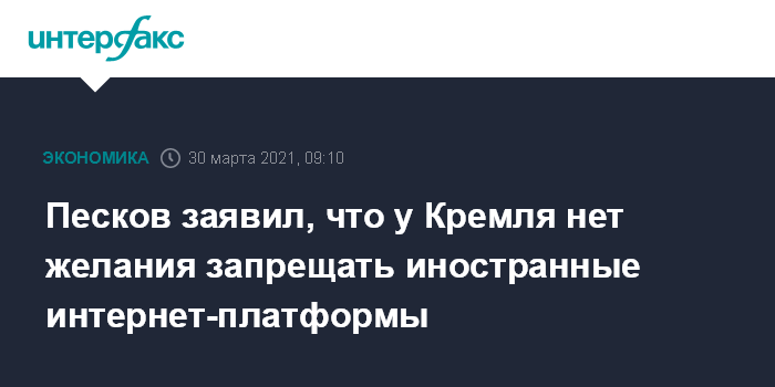Москва. 30 марта. INTERFAX.RU - Кремль не хочет полного запрета иностранных интернет-платформ, но считает необходимым вынудить их выполнять российские правила, и чем "больше жизни" в интернете, тем больше там должно быть правил, заявил "АиФ" пресс-секретарь президента Дмитрий Песков. Он отметил сложность и кропотливость диалога с такими компаниями.