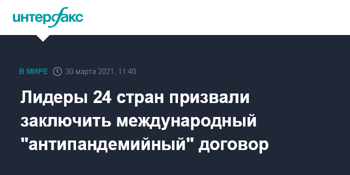 Москва. 30 марта. INTERFAX.RU - Главы 24 государств мира, а также генеральный директор ВОЗ Тедрос Аданом Гебреисус подписали письмо с призывом заключить международный договор, направленный на борьбу с будущими пандемиями.