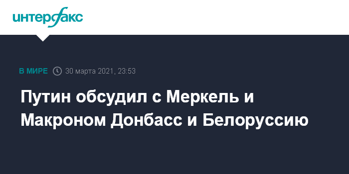 Москва. 30 марта. INTERFAX.RU - Президент России Владимир Путин в ходе переговоров в формате видеоконференции с канцлером Германии Ангелой Меркель и президентом Франции Эммануэлем Макроном обсуждал ситуацию в Донбассе и Белоруссии, сообщает пресс-служба Кремля.