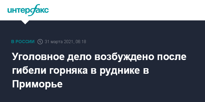 Москва. 31 марта. INTERFAX.RU - Гибель рабочего на руднике "Королевский" в Приморье, где во вторник обрушилась порода, будет расследоваться в рамках уголовного дела о нарушении правил безопасности, сообщило в среду следственное управление СКР по региону.