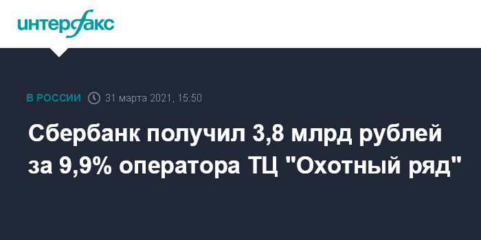 Москва. 31 марта. INTERFAX.RU - Структура Сбербанка вернула 9,9% компании, управляющей московским торговым центром "Охотный ряд", ее основным собственникам, получила за эту долю 3,8 млрд рублей. Об этом говорится в отчете "Сбербанка инвестиции" по РСБУ.