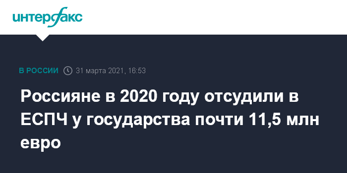 Москва. 31 марта. INTERFAX.RU - ЕСПЧ в 2020 году присудил гражданам России компенсации от государства в общей сложности на 11 458 094 евро, говорится в ежегодном отчете Комитета министров Совета Европы (КМСЕ) по исполнению постановлений ЕСПЧ.