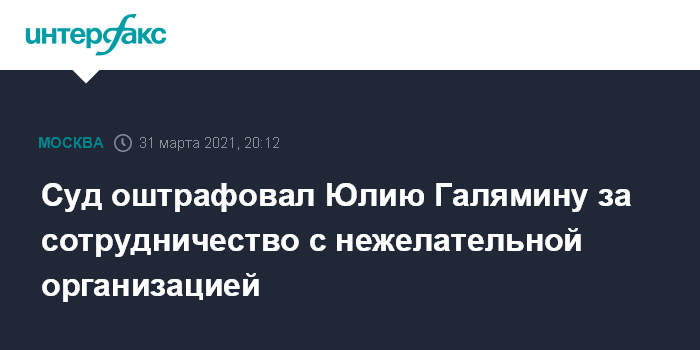 Москва. 31 марта. INTERFAX.RU - 299-й судебный участок по столичному району Северное Измайлово признал бывшего муниципального депутата Юлию Галямину виновной в сотрудничестве с нежелательной на территории РФ организацией и назначил ей штраф в размере 15 тыс. рублей.