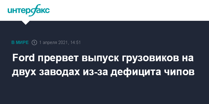 Москва. 1 апреля. INTERFAX.RU - Американский автопроизводитель Ford Motor сообщил, что приостановит производство грузовиков на двух заводах в США из-за недостатка полупроводников.