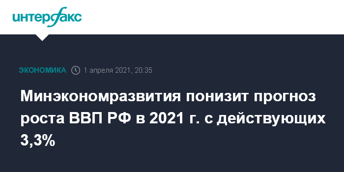Москва. 1 апреля. INTERFAX.RU - Минэкономразвития понизит прогноз роста ВВП РФ на 2021 год с действующих 3,3% из-за меньшего падения экономики в 2020 году, чем ожидалось, сказал журналистам министр экономического развития Максим Решетников.