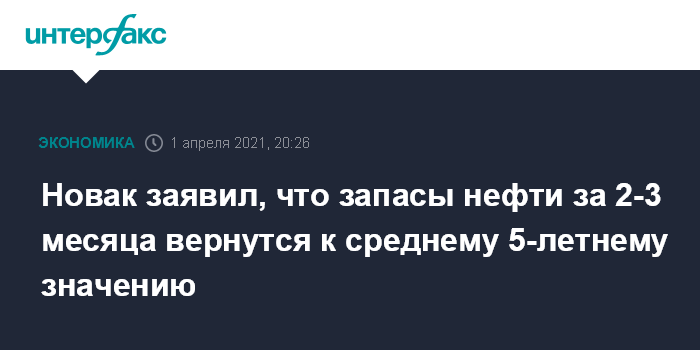 Москва. 1 апреля. INTERFAX.RU - Запасы нефти в ближайшие два-три месяца должны вернуться к среднему 5-летнему значению (2015-2019 годы), сообщил в интервью телеканалу "Россия 24" вице-премьер РФ Александр Новак.