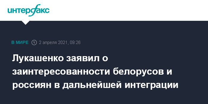 Москва. 2 апреля. INTERFAX.RU - Белорусы и россияне кровно заинтересованы в дальнейшей интеграции, говорится в поздравлении белорусского президента Александра Лукашенко с днем единения народов двух стран.