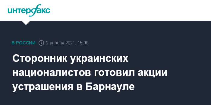 Москва. 2 апреля. INTERFAX.RU - ФСБ сообщила о задержании сторонника украинских националистов в Барнауле, готовившего акции устрашения против иностранцев и органов госвласти.