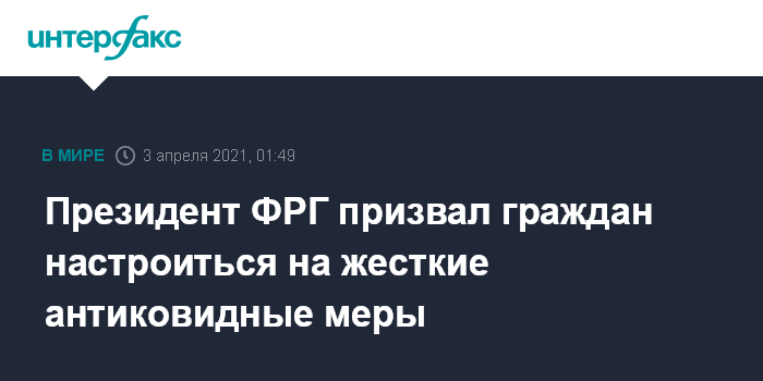 Москва. 3 апреля. INTERFAX.RU - Президент Германии Франк-Вальтер Штайнмайер выступил с пасхальным обращением к согражданам и призвал их настроиться на жесткие ограничения в связи с пандемией коронавируса.