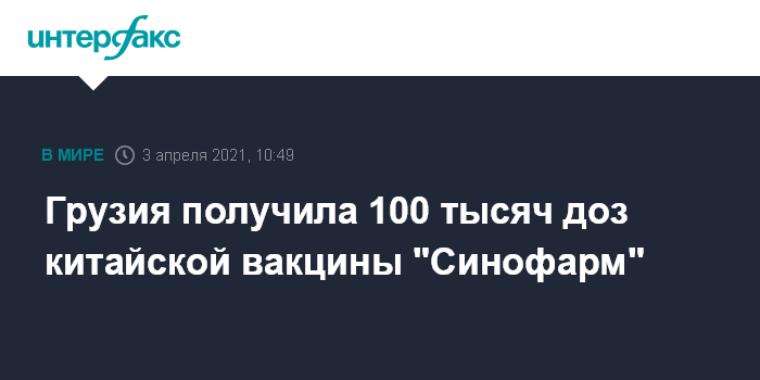 Москва. 3 апреля. INTERFAX.RU - В Грузию в субботу доставлено 100 тысяч доз китайской вакцины против коронавируса COVID-19 "Синофарм".