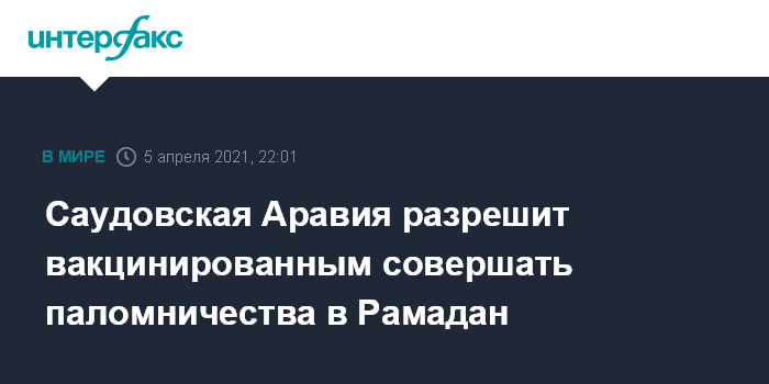 Москва. 5 апреля. INTERFAX.RU - В саудовском министерстве по делам хаджа заявили в понедельник, что власти страны предоставят разрешение на посещение святых мест в период Рамадана паломникам, привитым от COVID-19, сообщает телеканал "аль-Арабийя".