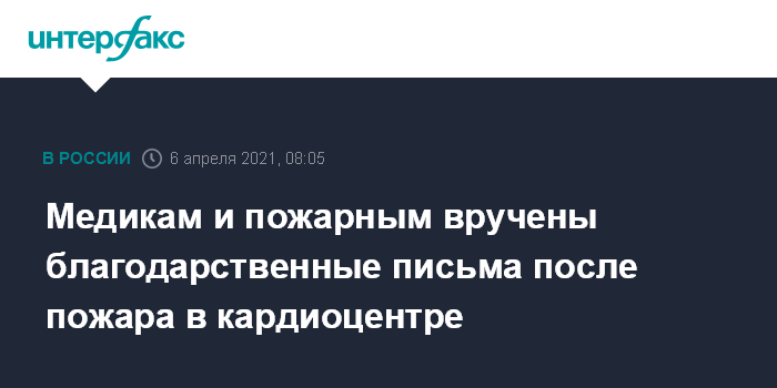 Москва. 6 апреля. INTERFAX.RU - Десять пожарных и столько же медицинских работников отмечены благодарственными письмами губернатора за профессионализм, который они проявили во время крупного пожара в кардиоцентре Амурской области.