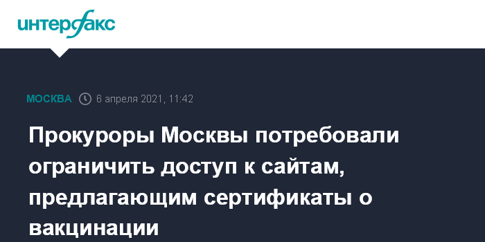 Москва. 6 апреля. INTERFAX.RU - Столичные прокуроры обратились в Таганский суд Москвы с иском об ограничении доступа к сайтам с объявлениями о продаже сертификатов о вакцинации и медицинских справок.