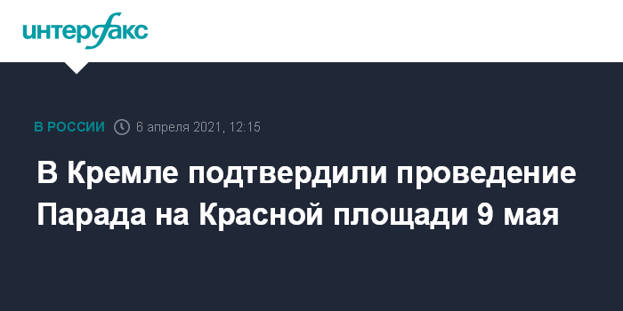 Москва. 6 апреля. INTERFAX.RU - Военный парад, посвященный 76-й годовщине Победы в Великой Отечественной войне, пройдет 9 мая на Красной площади, сообщает пресс-служба Кремля.