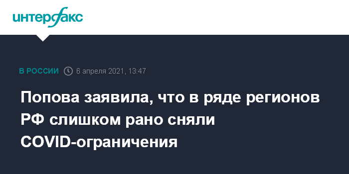 Москва. 6 апреля. INTERFAX.RU - Некоторые регионы РФ начали преждевременно снимать ограничения по коронавирусу, в 18 субъектах они отменены для людей от 65 лет, хотя в этой возрастной группе отмечается рост заболеваемости, заявила глава Роспотребнадзора Анна Попова.