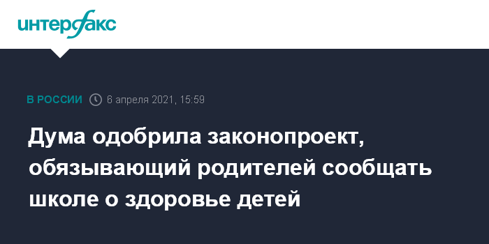 Москва. 6 апреля. INTERFAX.RU - Государственная Дума приняла в первом чтении законопроект, который закрепляет обязанность родителей учеников сообщать в образовательную организацию о здоровье своего ребенка.