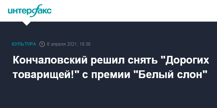 Москва. 6 апреля. INTERFAX.RU - Режиссер Андрей Кончаловский принял решение снять свою картину "Дорогие товарищи!" с номинаций Национальной премии кинокритики и кинопрессы "Белый слон" за 2020 год; по его мнению, в этом году в награде появился политический аспект.