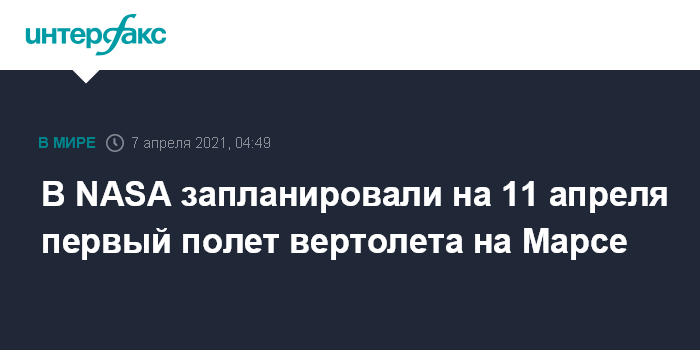 Москва. 7 апреля. INTERFAX.RU - В NASA планируют не раньше 11 апреля совершить первую попытку полета вертолета Ingenuity ("Изобретательность") на Марсе, сообщается на сайте ведомства.