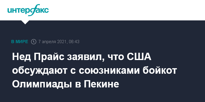 Москва. 7 апреля. INTERFAX.RU - Пресс-секретарь американского Госдепа Нед Прайс заявил журналистам, что США обсуждают с союзниками и партнерами вопрос о совместном бойкоте зимних Олимпийских игр 2022 года в Пекине, позднее представитель ведомства опроверг это заявление.