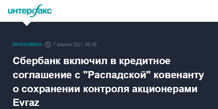 Москва. 7 апреля. INTERFAX.RU - Условия нового кредитного соглашения "Распадской" со Сбербанком предполагают сохранение контроля над компанией основными акционерами Evraz.