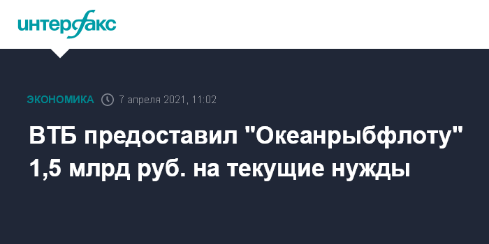 Москва. 7 апреля. INTERFAX.RU - Банк ВТБ предоставил АО "Океанрыбфлот" (Петропавловск-Камчатский, одно из крупнейших рыбопромышленных предприятий РФ) среднесрочное финансирование в размере 1,5 млрд рублей на обеспечение текущей деятельности компании, сообщила пресс-служба банка.