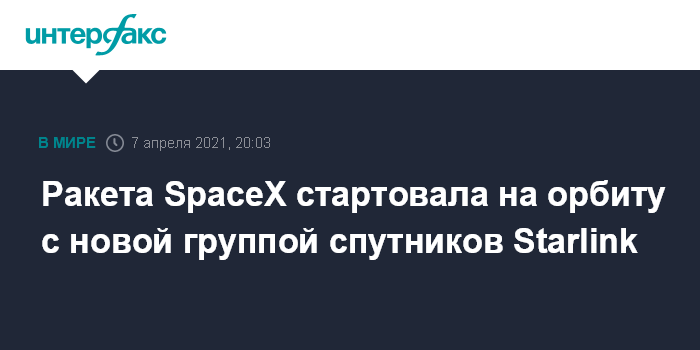 Москва. 7 апреля. INTERFAX.RU - Тяжелая ракета-носитель Falcon 9 в среду стартовала на орбиту с очередной партией из 60 мини-спутников для пополнения орбитальной группировки глобальной сети интернет-покрытия системы Starlink, сообщила компания-разработчик SpaceX.