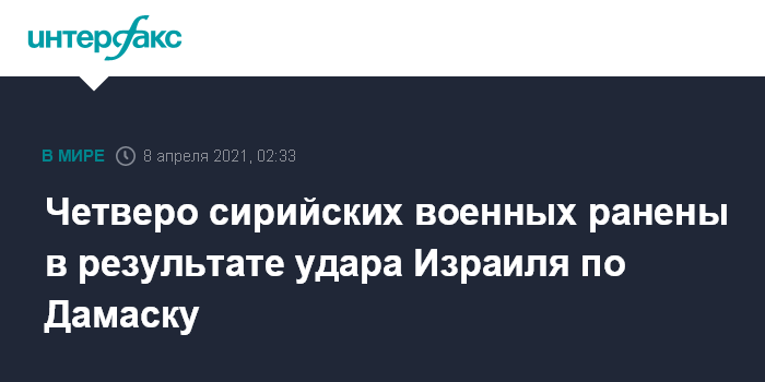 Москва. 8 апреля. INTERFAX.RU - Четверо сирийских военных были ранены в результате израильского авиаудара по Дамаску в среду вечером, сообщает сирийское государственное информационное агентство SANA.