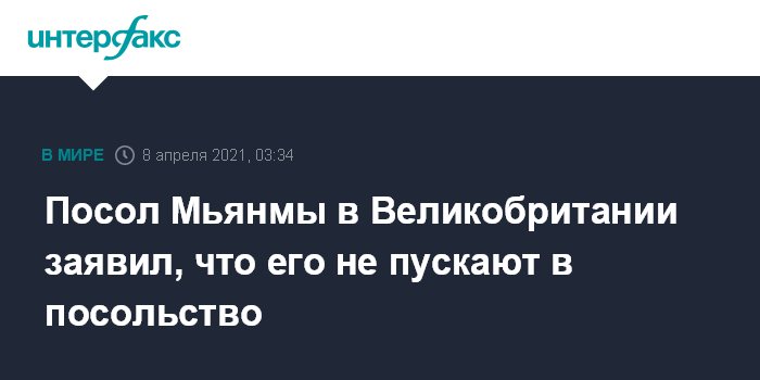 Москва. 8 апреля. INTERFAX.RU - Посол Мьянмы в Великобритании Чжо Зо Мин заявил, что его не пускают на территорию посольства страны в Лондоне.