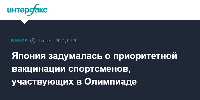 Москва. 8 апреля. INTERFAX.RU - Японское правительство изучает возможность вакцинации от коронавируса в приоритетном порядке спортсменов, которые должны принять участие в Олимпийских играх в Токио, сообщило агентство Kyodo.